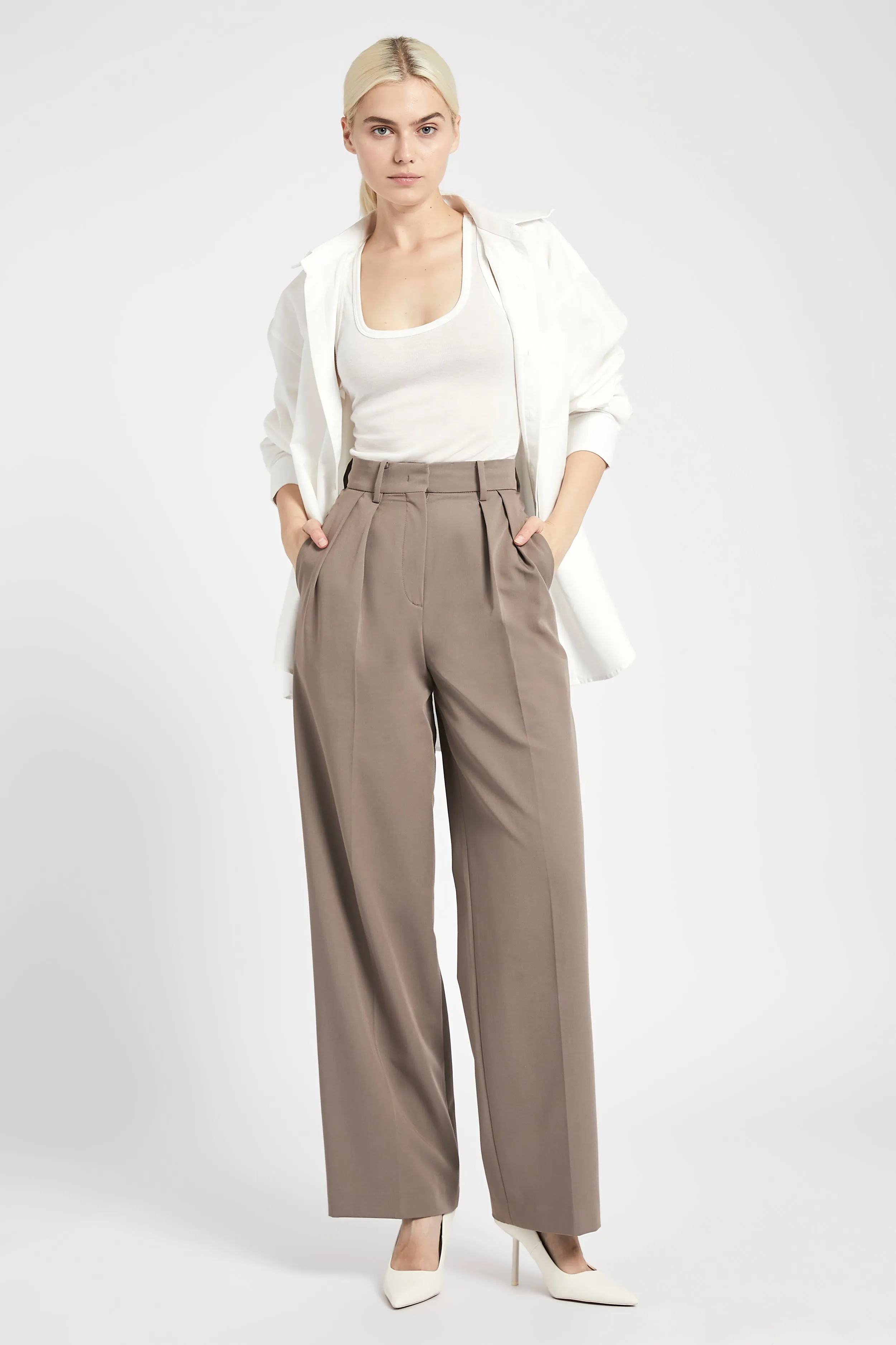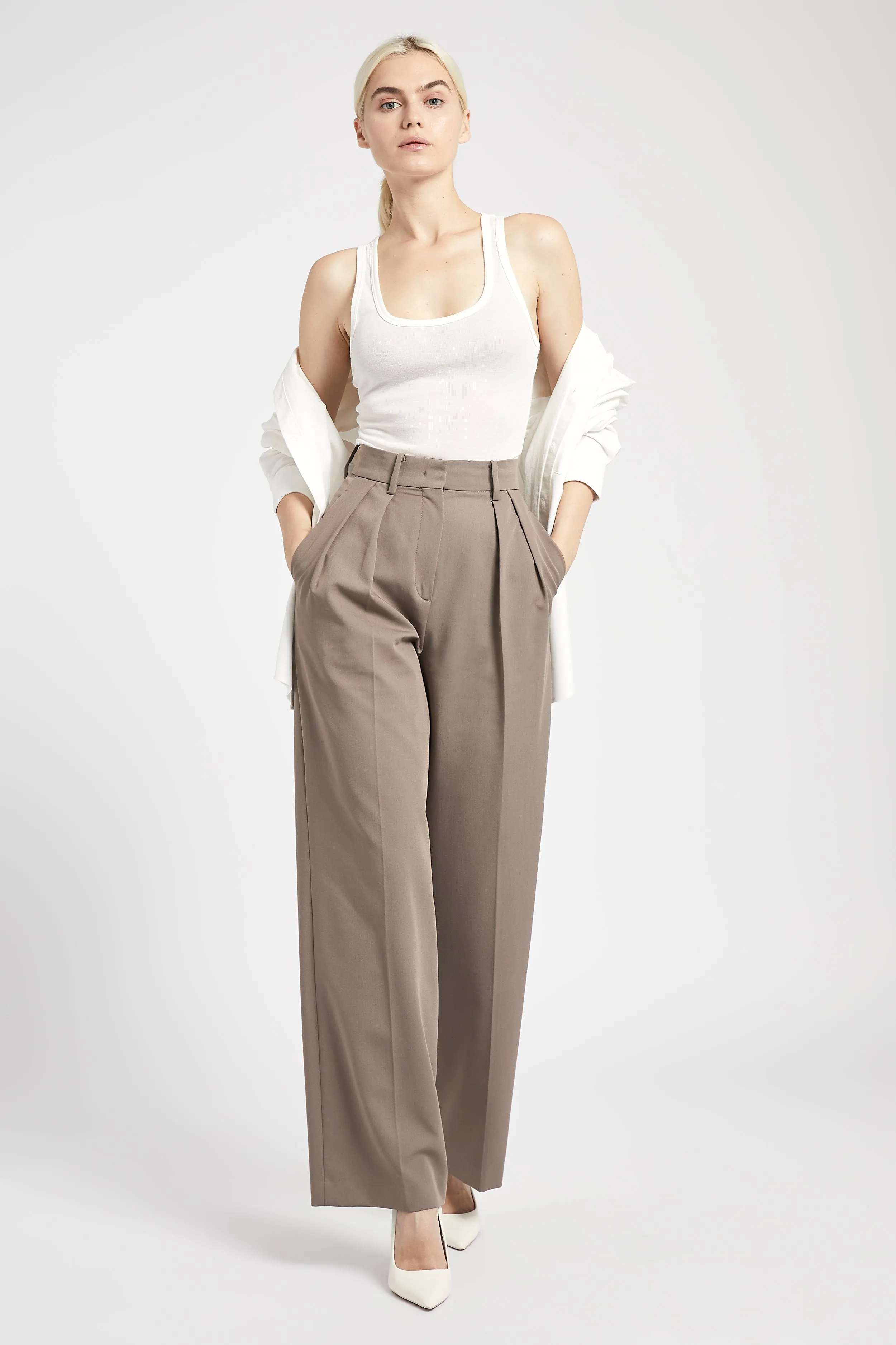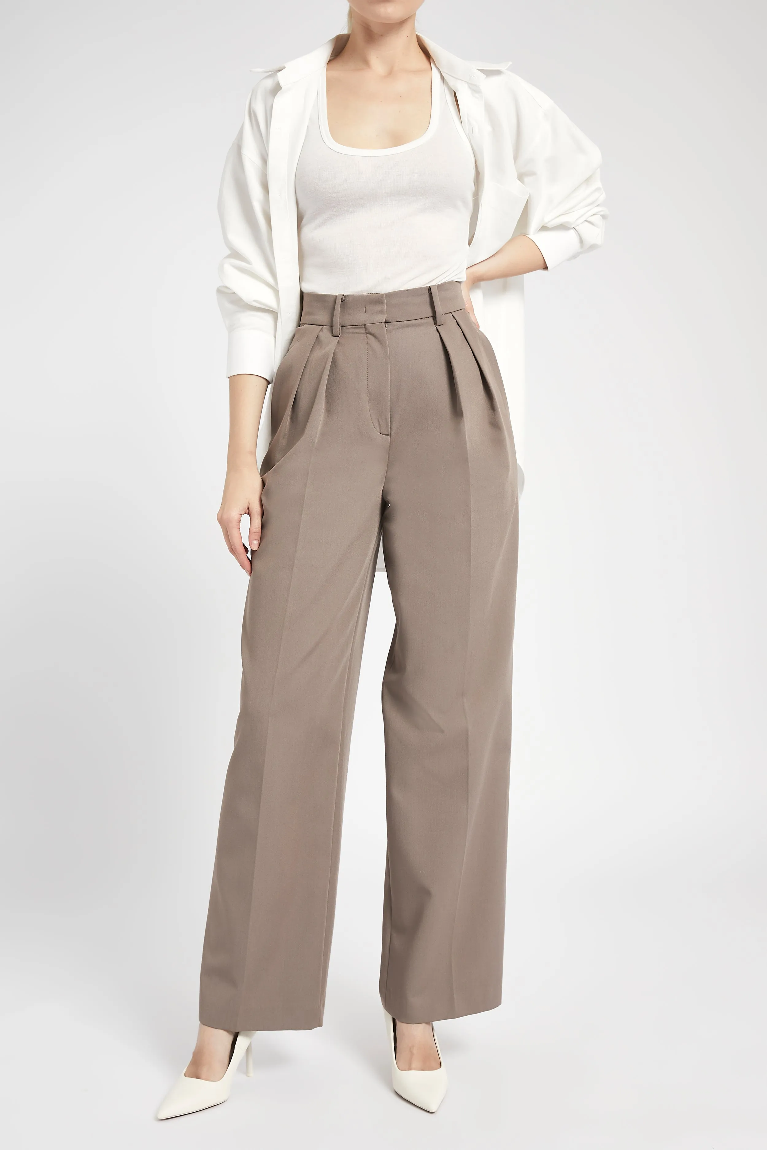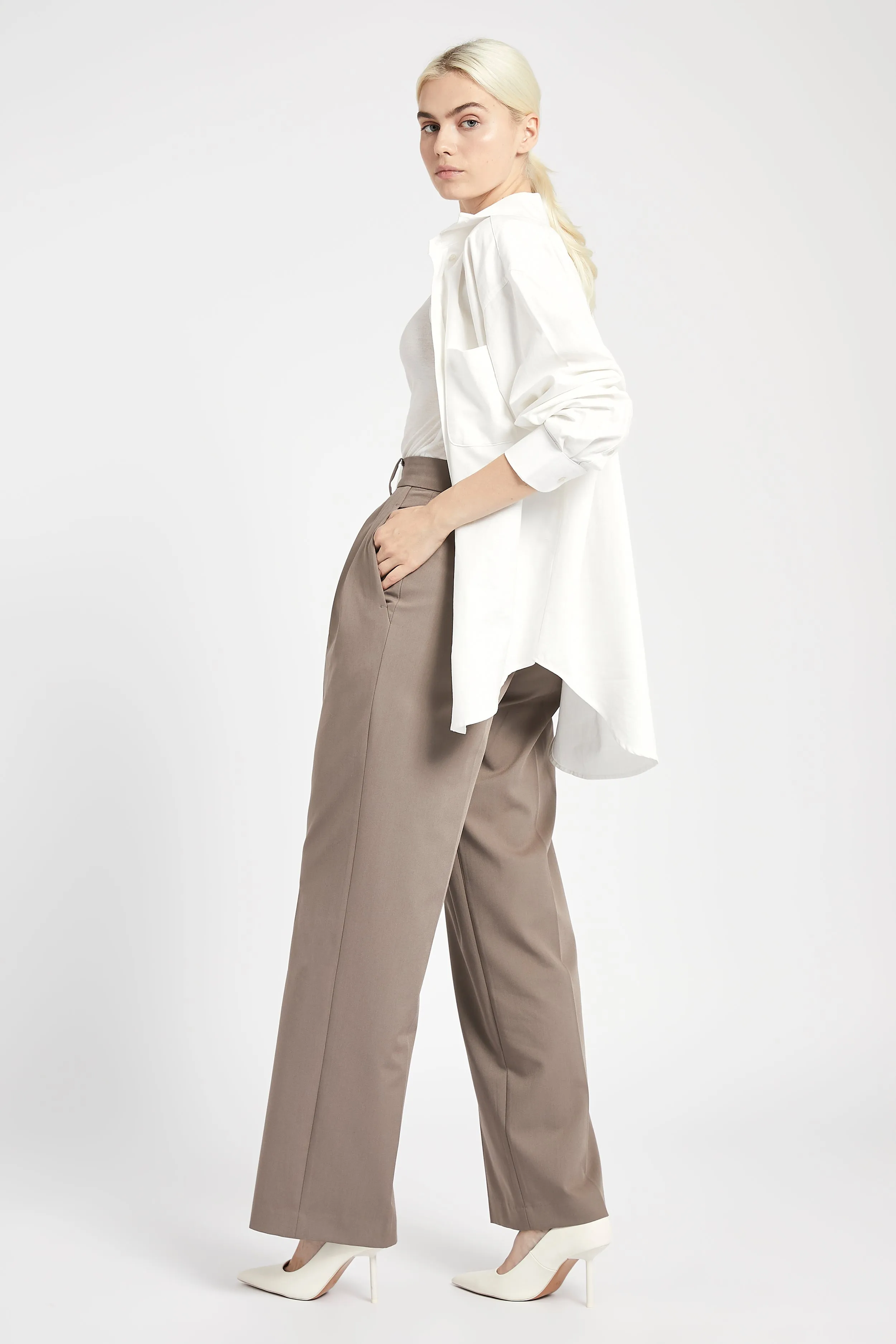 Relaxed fit, longer length wide leg trousers cut in a boxy, masculine style in a lightweight traditional suiting fabric. Finished with double pleat detail, slanted front pockets and decorative welted back pocket, hook and t-bar closure and fly front with a decorative internal waistband.