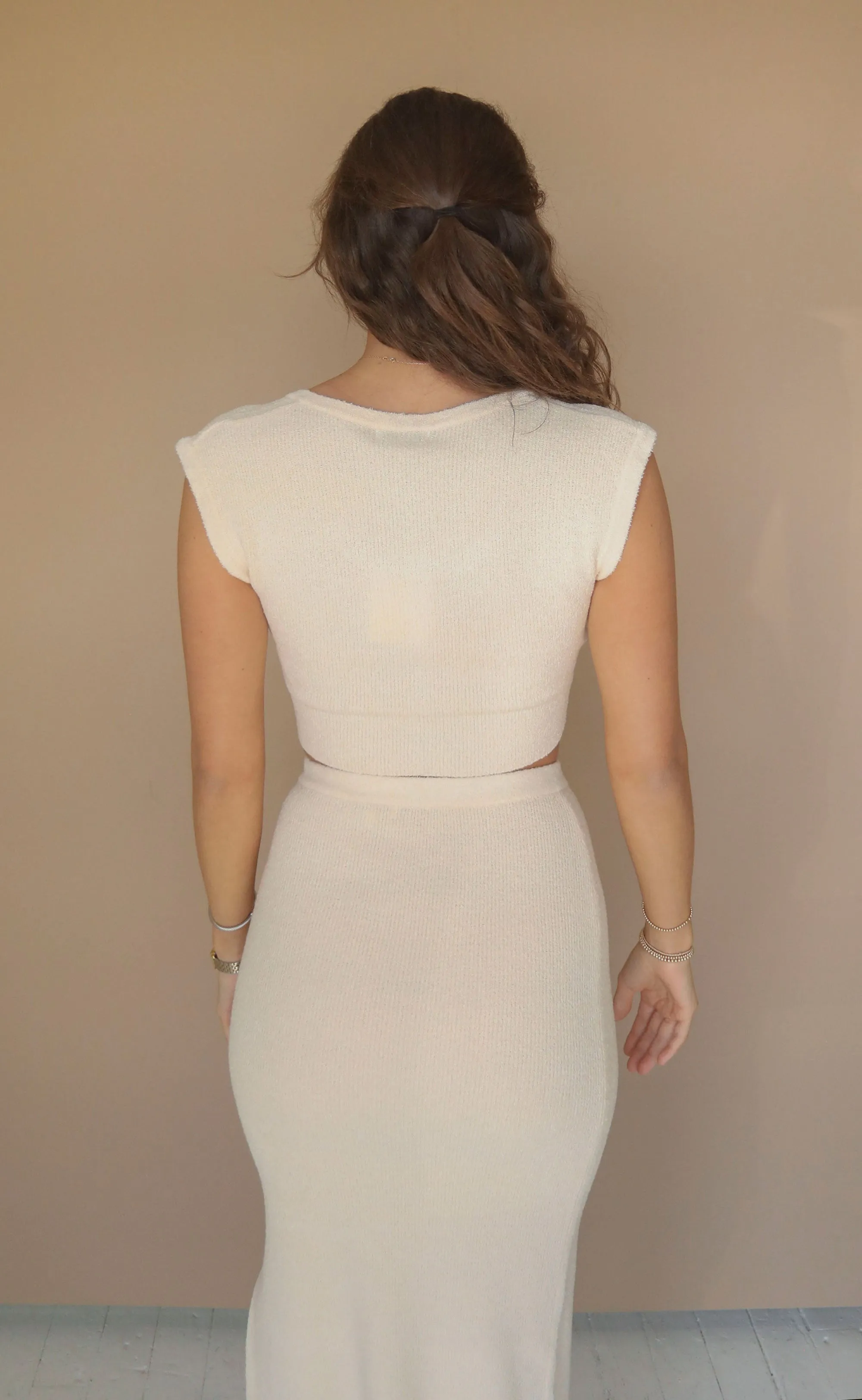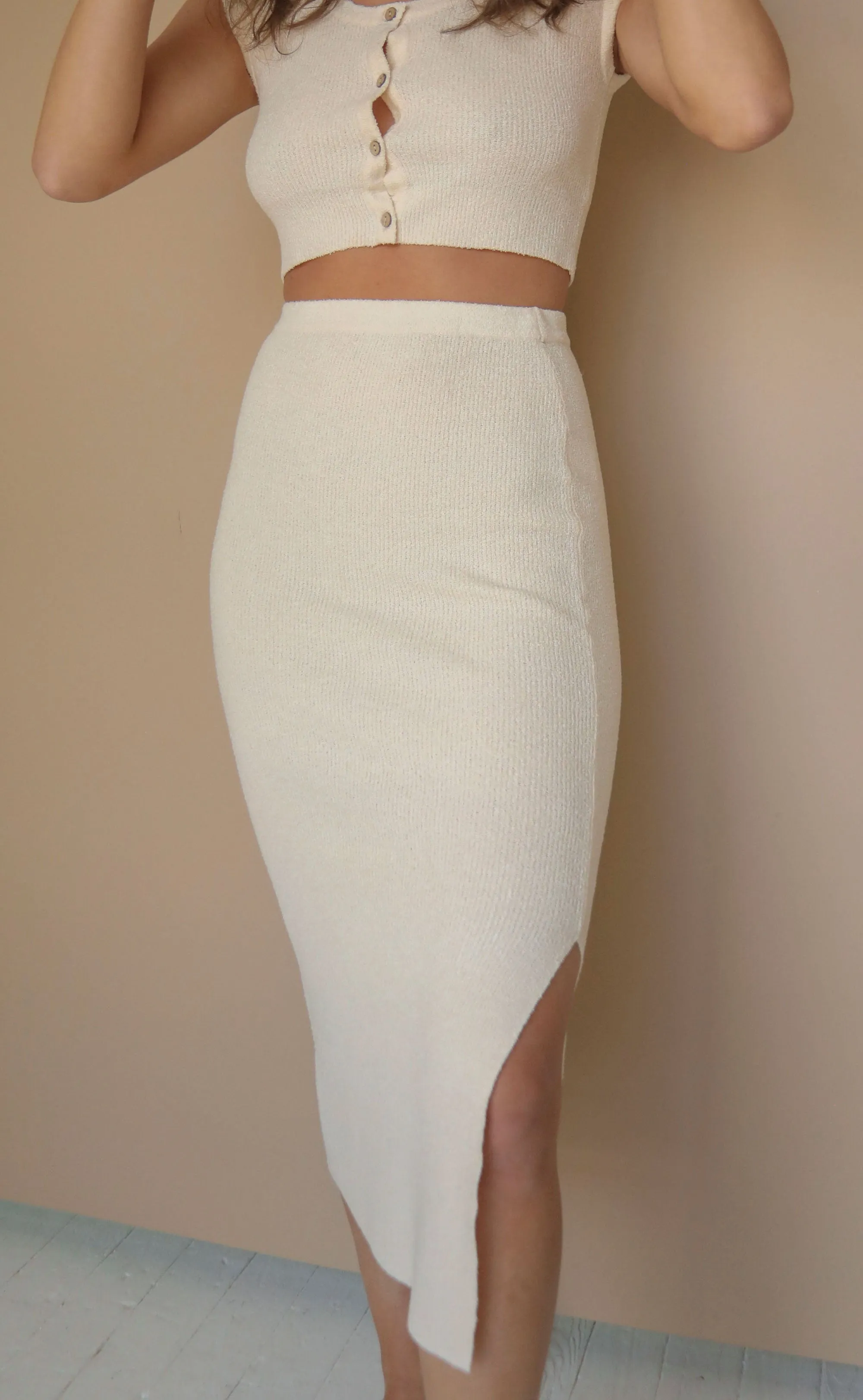 This ribbed knit set is begging to be worn to the beach and all your other summer vacations. With a button front crop top and a high rise midi skirt complete with a slit, this set has it all! Pack in your bag to wear together or mix and match to make it easier to fit everything in just a carry on. ;)