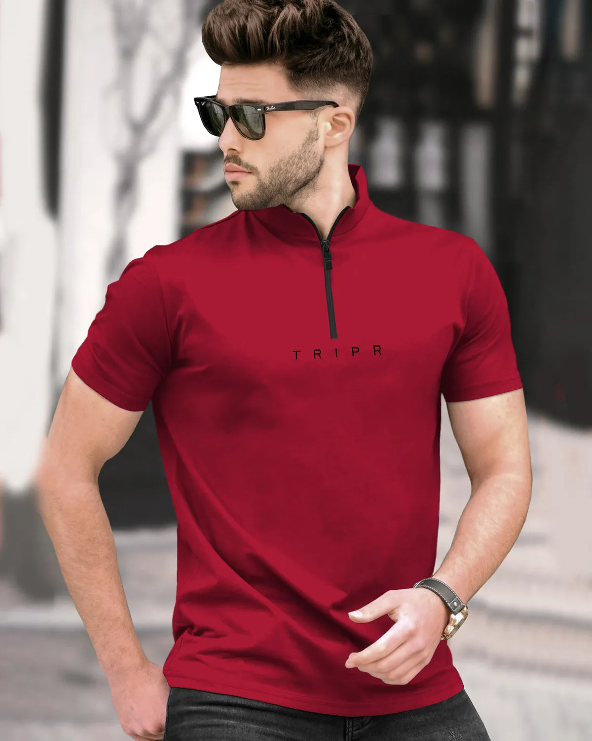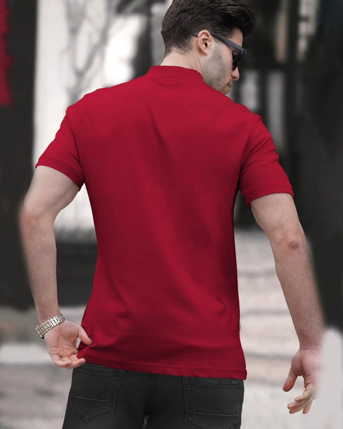 - Red Colour Short Sleeve Zip Neck T shirt, provides a stylish contrast.
